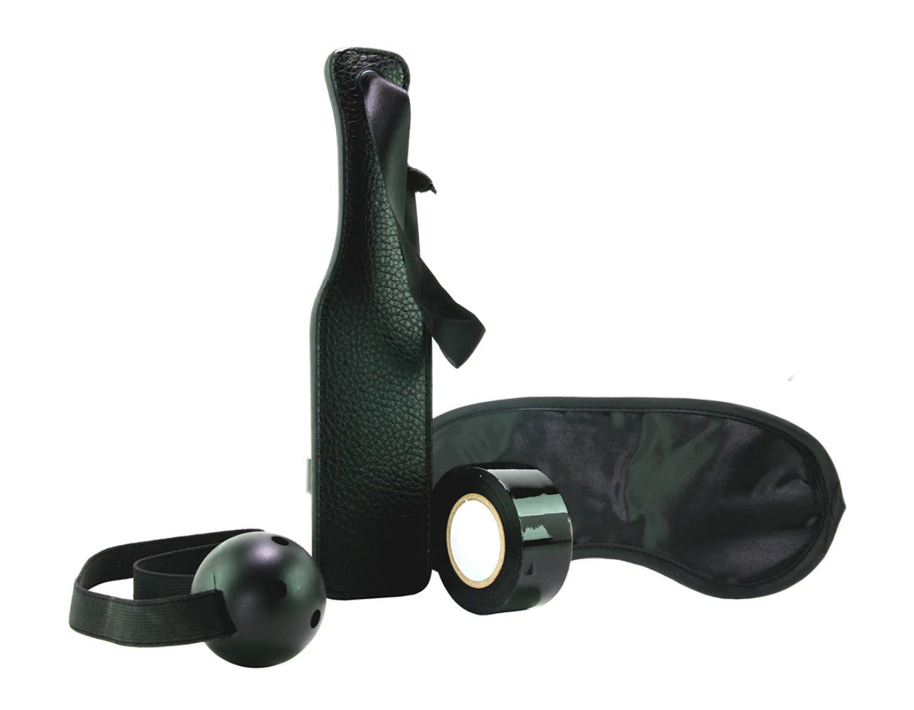 Once you or your playmate is locked up, positioned or otherwise restrained (perhaps with the glossy Bondage Tape), you can explore sensation with the Spanking Paddle or a classic Faux Leather Flogger. Silence them with an included adjustable breathable Ball Bag while you control every movement using the Collar & Leash.