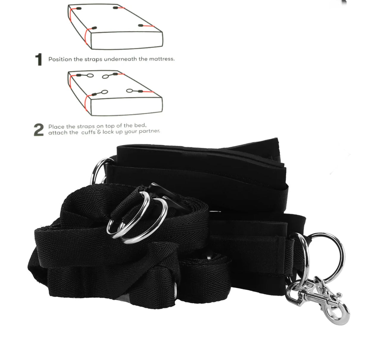 Seriously, the treats in this kit are up for anything. You can start with a classic Bedspreader Bed bondage set that slips easily under any sized mattress, leaving four plushy (still secure!) cuffs free to lock up a partner's wrists and ankles.
