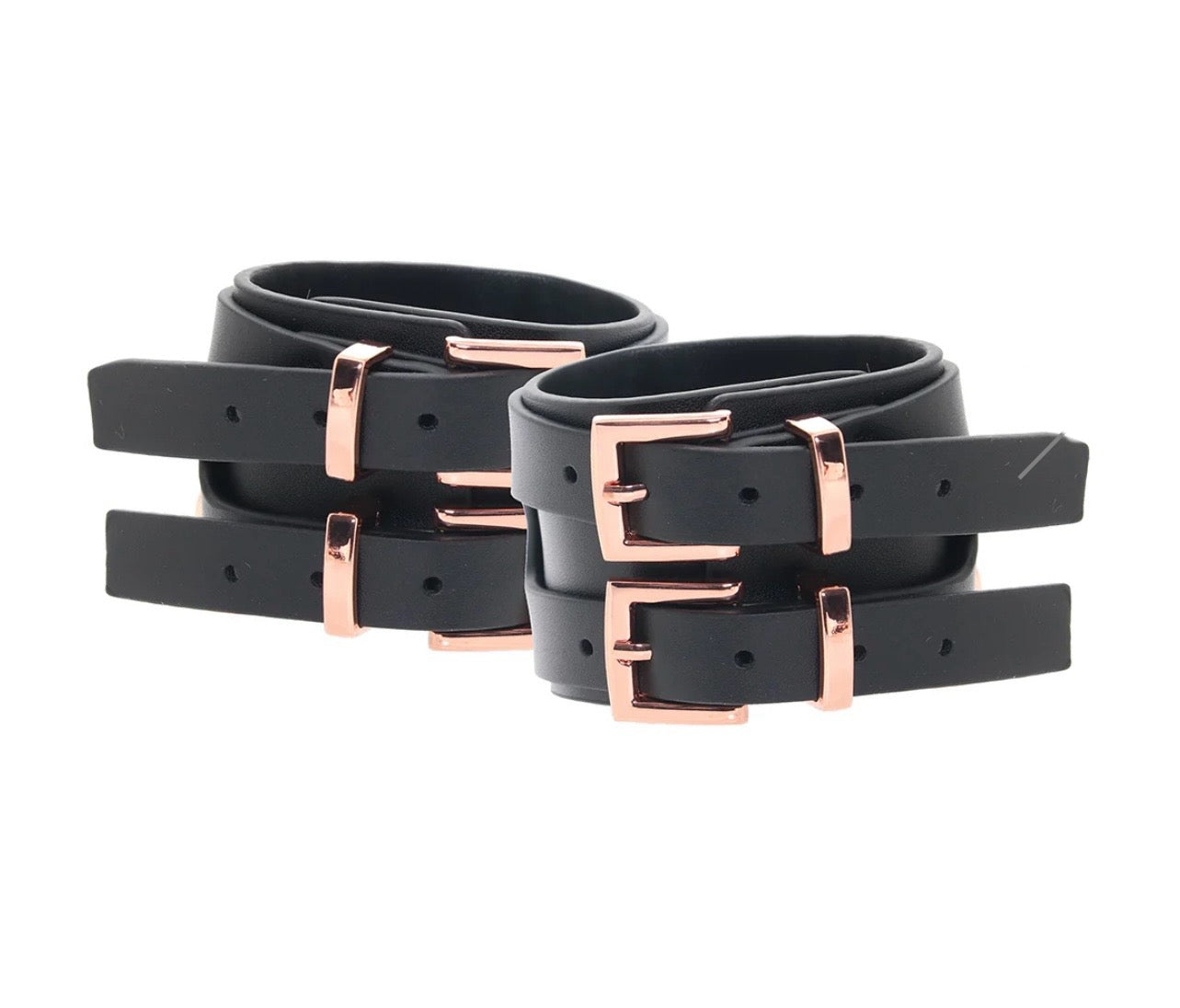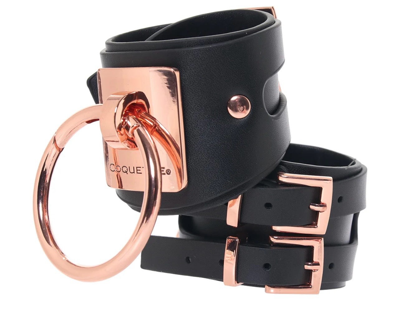 Soft and supple, the thick bands circle your or a partner's wrists, fastening around the back with a double rose gold buckle. Up front, a matching rose gold plate holds an oversized (and removable!) ring with a simple catch. Hook it up to the other cuff or pair it with body harnesses, bondage lingerie, and/or other BDSM gear.